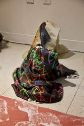 I made the figure of the Goddess Laxmiji out of sugarcane, Kalash (Metal Pots), and Mauli (sacred religious thread) to touch upon my Hindu roots, but draped her in non-traditional clothing. To understand which and what category of attire is essential to drape Laxmiji in I then made it my own. Laxmiji is usually draped in garments as cherished and elegant one could obtain (or afford); for me, my most treasured possessions are my artworks, and so I draped my twenty-five Laxmiji's in cut-up folded paintings or digital works reprinted on silk to make her saris/sarees. Since Ashram 25, 2021, was celebrating my graduation along with finishing my first Ashram, I felt like there had to be a dance celebration.